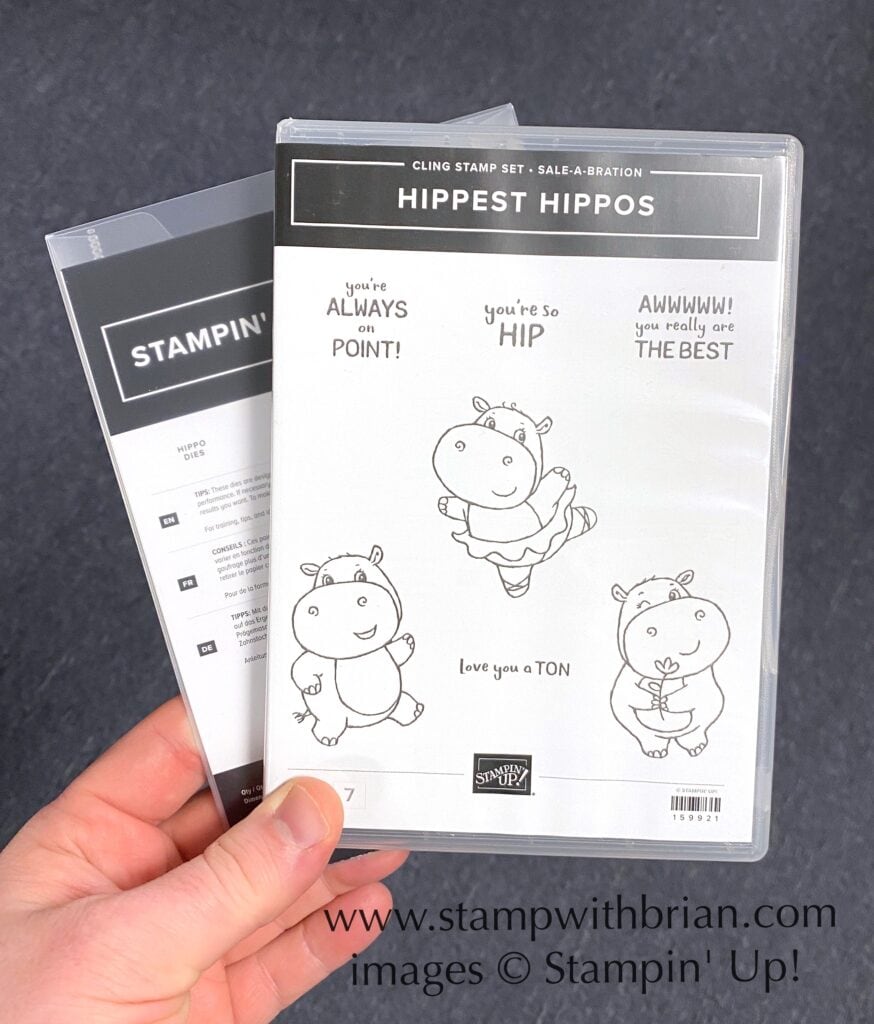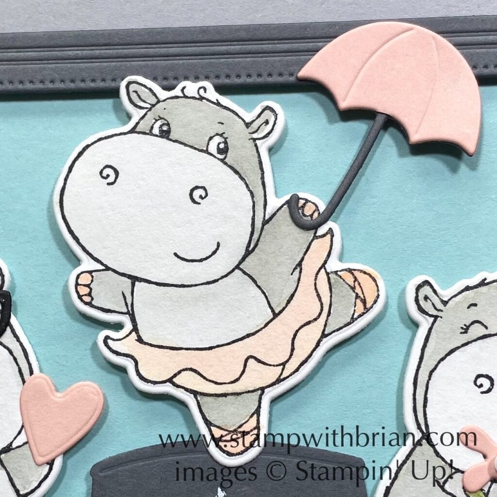 The hippos and sentiment are from Hippest Hippos, a Sale-a-Bration stamp set, and the glasses, heart, umbrella, flower and stage (an upside-down bucket) are from the coordinating Hippo Dies. Each of these items can be selected with a $50 purchase during July and August (you can get both with a $100 order). Here’s a look at these items: