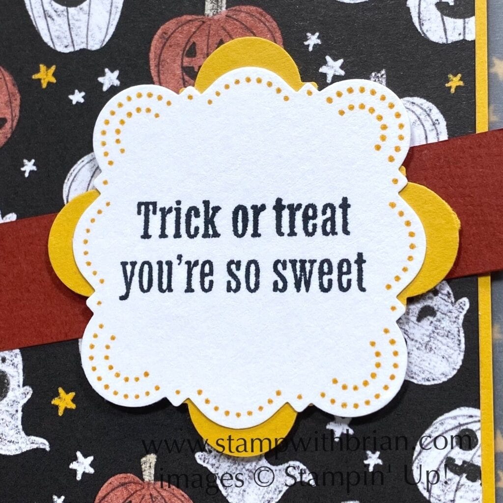 I enjoy the cute and creative side of Halloween. When cute costumes, festive pumpkins and candy are involved, I’m all in. A couple of ghosts peppered in doesn’t ruin the fun for me, but I draw the line at haunted houses. No, thanks. I couldn’t help but to play with the Celebrate Everything Host Designer Series Paper for another Halloween card (you can see my first one here) to share with you today. Here’s my card: