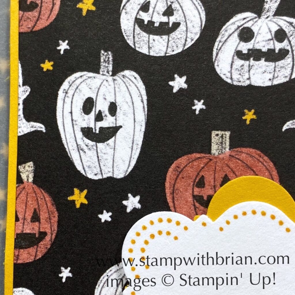 While some of the stars on the top panel are colored in Crushed Curry, the rest of the page is black-and-white. I added a little flavor to the page by colors a select few of the jack-o-lanterns with my Light Cajun Craze Stampin’ Blend (and added a little Light Crumb Cake to the stems). Here’s a closer look: