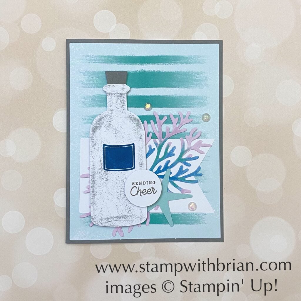 I stamped the bottle label from the stamp set on the punched-out bottle and stamped the sentiment on Thick White cardstock and cropped it with a Layering Circle Die. Behind the bottle and sentiment, I layered coral, a sea star and a banner (turned upside down to show the white side). I added three Opal Rounds for the look of bubbles. Here’s a closer look a this card: