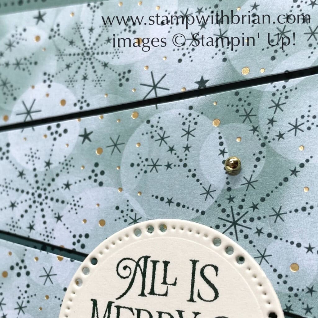 To coordinate with the gold foil accents in the Lights Aglow pattern, I added three gold pearls from the Festive Pearls embellishments. Simple and sweet.