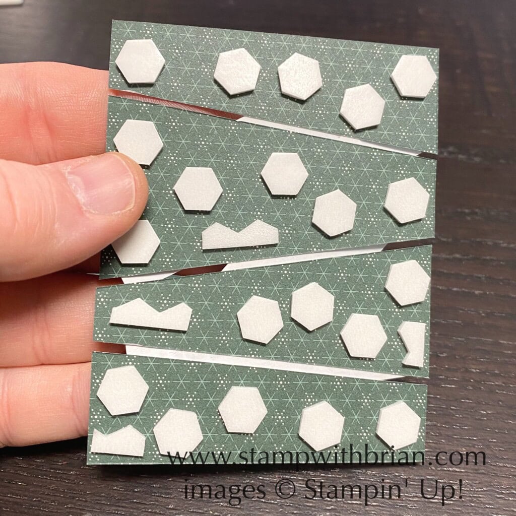 See? I told you it was gorgeous! 🙂 Rather than just layer the two panels on my card, I decided to cut a fun pattern into the top panel with my Paper Trimmer. I simply cut three alternating diagonals into the 3″ x 3-3/4″ panel to create four pieces. I connected the pieces with a sticky note, allowing a small break between the pieces and flipped the panel over to add a few Stampin’ Dimensionals (and then a few more). Here’s a look at the back of this panel:
