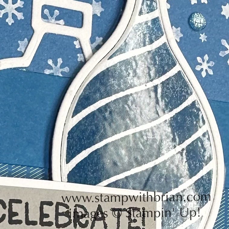 Spruced Up Bundle, Stampin Up! 159701After I stamped the ornament (and before I cropped it), I covered the image with a strip of packing tape. The tape gives the image a shine that could also be created with Clear Embossing Powder over the entire image, but that would take a lot of time. The packing tape is quick and easy and shiny. Here’s a closer look at the ornament on the card: