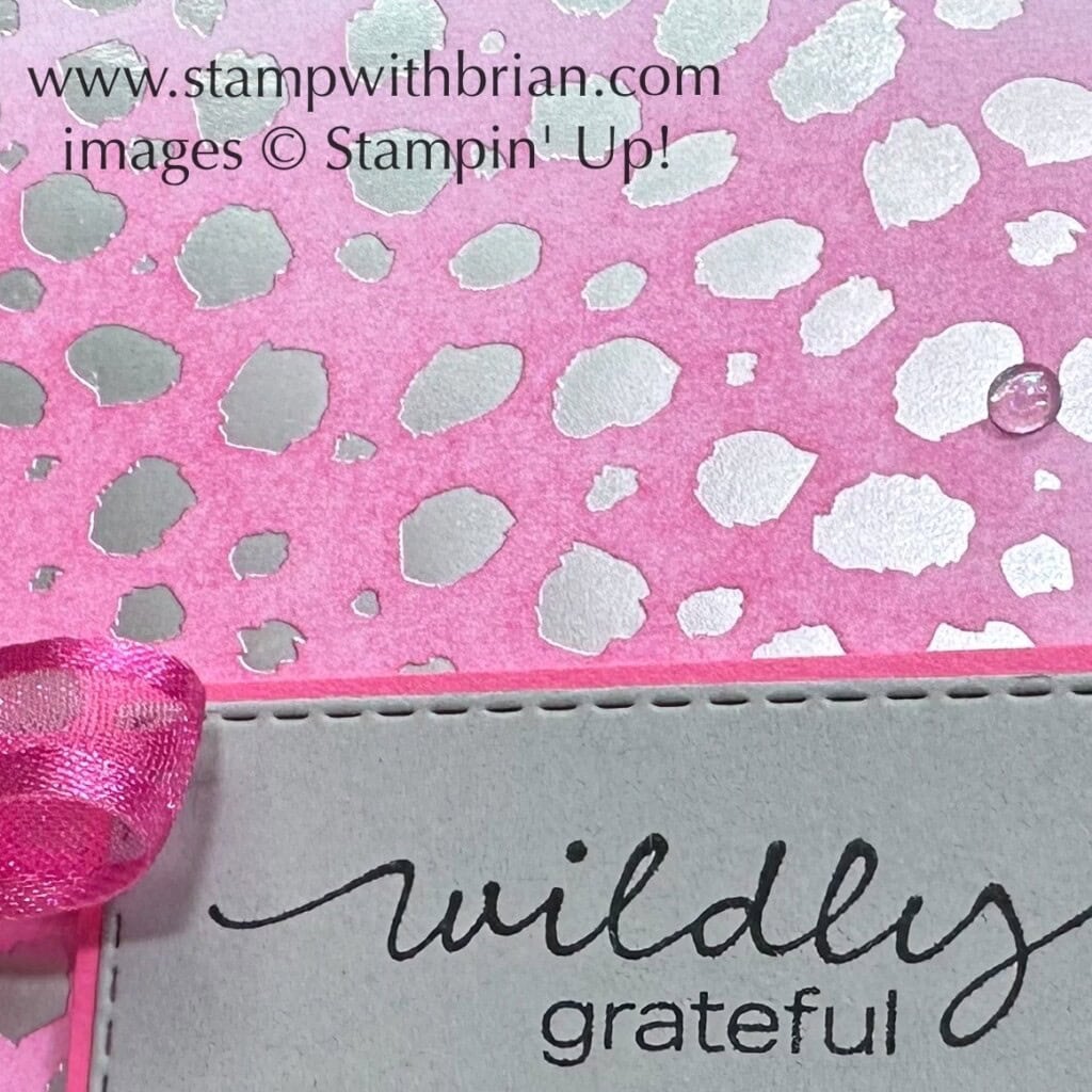 Animal prints have been “en vogue” for several years, and they don’t seem to be losing popularity. Stampin’ Up!’s January-April 2023 Mini Catalog offers a 12 animal prints in the Like an Animal Specialty Designer Series Paper – and there are so many fun ways to show case them. I simply added a little ink to a silver foil pattern to create this fun card: