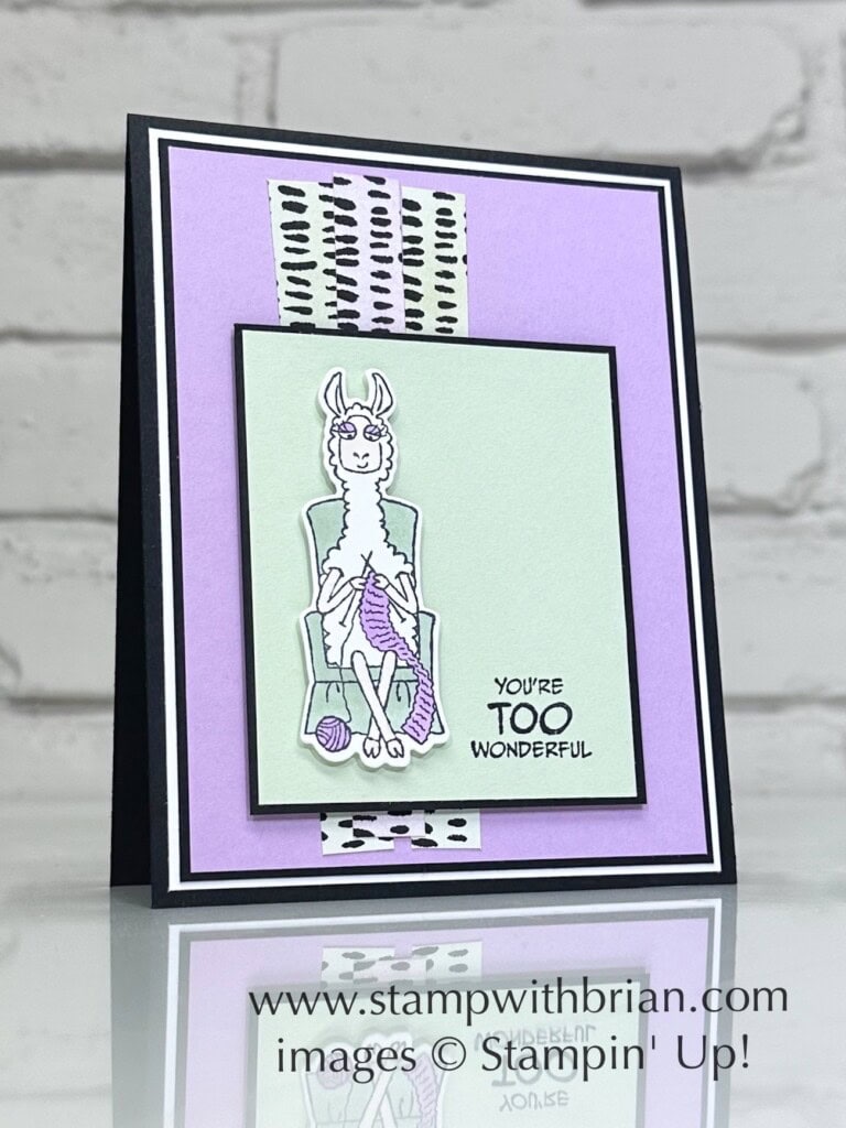 Cheetahs dancing ballet, turtles singing karaoke, alligators riding a bicycle. These characters are fun and cute, but I dare you to point to a person who doesn’t love a knitting llama! Stampin’ Up!’s Zany Zoo Bundle, new in the upcoming 2023 Annual Catalog features a variety of animals having human fun, but it’s the knitting llama that caught my eye and forced me to add this bundle to my pre-order. SO CUTE! Here’s a card I made with the Zany Zoo Bundle: