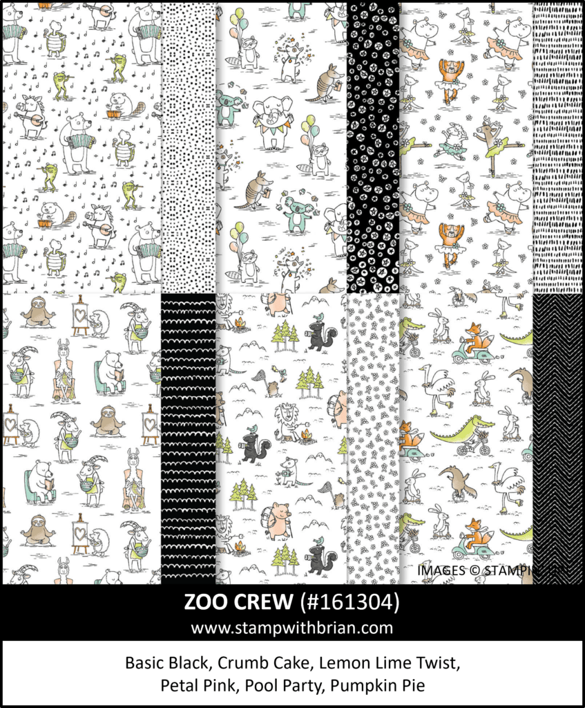 Bundles: Zany Zoo Bundle Stamps: Zany Zoo Papers: Zoo Crew Designer Series Paper, Basic Black, Fresh Freesia, Soft Sea Foam, Thick Basic White Inks: Memento Tuxedo Black, Stampin’ Blends (Soft Sea Foam, Fresh Freesia, Light Natural Tones) Accessories: Blending Brush, Zoo Crew Dies, Mini Stampin’ Dimensionals, Stampin’ Dimensionals