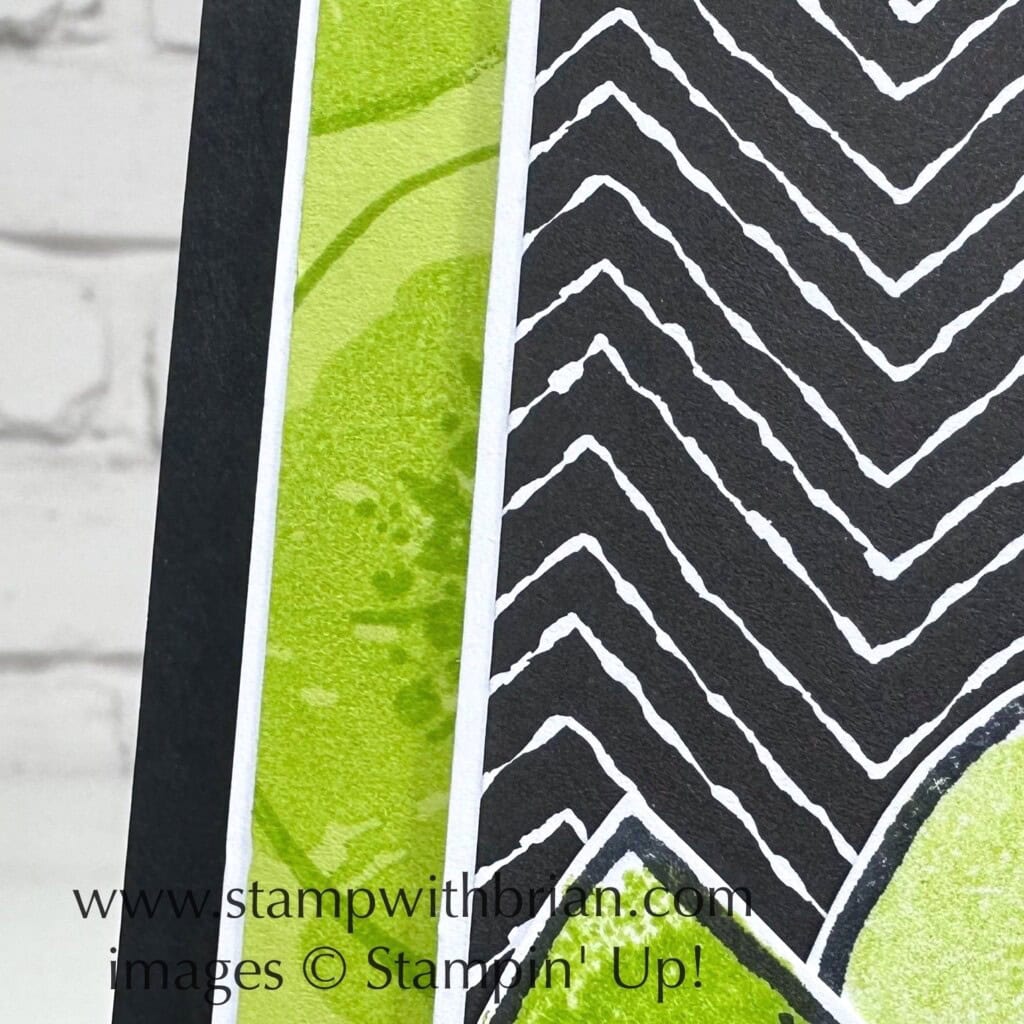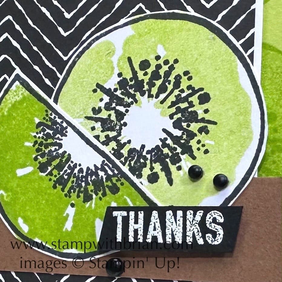 I added a 7/8″ strip of Pecan Pie cardstock to (1) provide a platform for my kiwis to rest on and (2) pull in the color of the outside of the kiwi. This soft brown isn’t the first color you might think to pair with Lemon Lime Twist and Basic Black, but I love it! It helps to break up the super-bright and super-dark colors on this card.