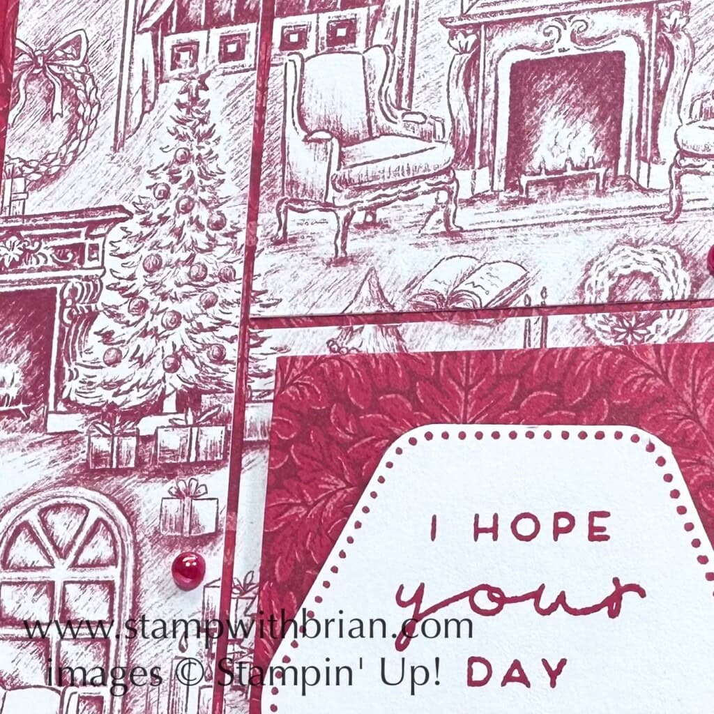 I cut the panel of Traditions of St. Nick Designer Series Paper in three pieces that showcased scenes on the paper. I framed the scene with an ornate design with Real Red and Cherry Cobbler. I love how the ornate pattern plays a background role on this card (but it’s also a very important one). Here’s a closer look: