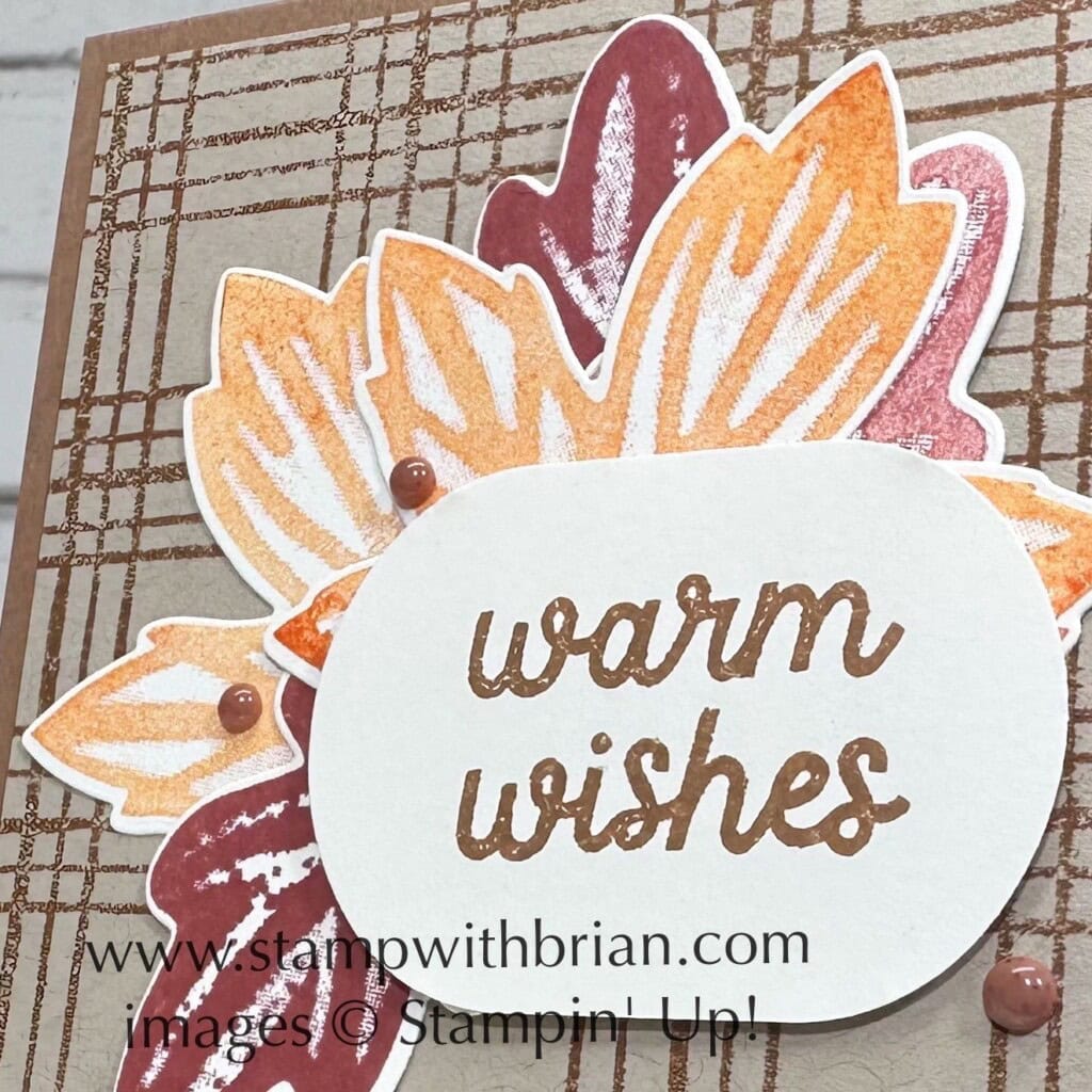 I arranged the leaves against the beautiful, plaid background and then topped them with a “warm wishes” sentiment that’s perfect for this time of year when things are cooling off a bit. I stamped the sentiment from the Beary Cute stamp set in Pecan Pie ink on a piece of Thick Very Vanilla and cropped it with the Modern Oval Punch. Fits perfectly! Here’s a look at the arrangement on my card: