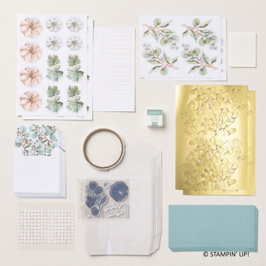 Today I’m sharing two alternative projects I shared with September’s With Love & Gratitude Kit – a gorgeous collection of leaves, pumpkins and gold accents. The kit includes gift bags and small cards – what a great kit designed with input from Shelli Gardner. Before I share one of my alternative projects, here’s a look at the finished projects (as designed) from the September 2023 Paper Pumpkin kit: