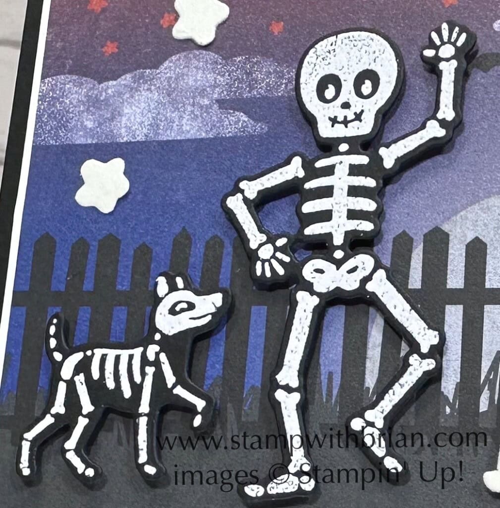 The skeleton and his pets are popped up with Mini Stampin’ Dimensionals on a panel I cropped from the Them Bones Designer Series Paper. Here’s a closer look at the man and his best friend: