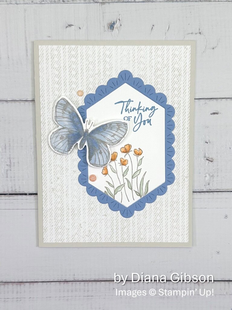 This is the second card swap Diana has participated in since she joined my Stampin’ Up! team – and I’m as blown away by this beauty as the first one she shared. It looks simple and sweet, but there are some great techniques and design elements in Diana’s card. Diana pairs a beautiful butterfly and sentiment from the Sketched Butterflies Bundle with the Wildflower Designs Dies – love the combination! Here’s Diana’s swap card: