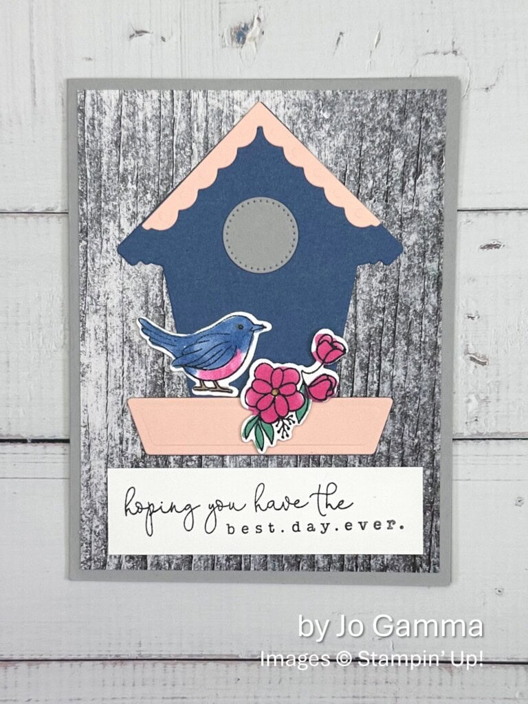 Jo’s swap card features stamped images and papers cropped with the Country Birdhouse Bundle, sure to be one of the most popular sets from the new catalog, and I love what she did with it! Her delightful bird and flowers are a sweet accent for the bird house, and I love the colors she chose. Here’s Jo’s swap card: