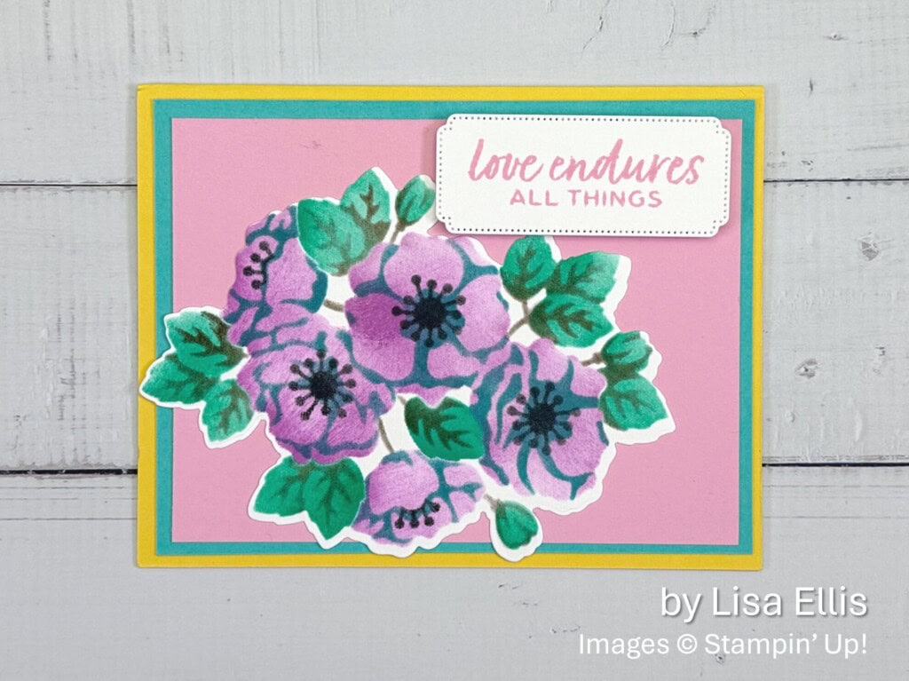 Not only does Lisa share the beauty of the the Enduring Beauty Stamp Set/Dies and the coordinating decorative masks used to color the flowers and leaves, but she showcases some gorgeous, new colors in the swap card she shared. With a Blending Brush and the Enduring Beauty Decorative Masks, Lisa built her flowers with beautiful colors (I spy Petunia Pop and Shy Shamrock) and then layered the flowers over Pretty in Pink, Summer Splash and Daffodil Delight. Here’s Lisa’s swap card: