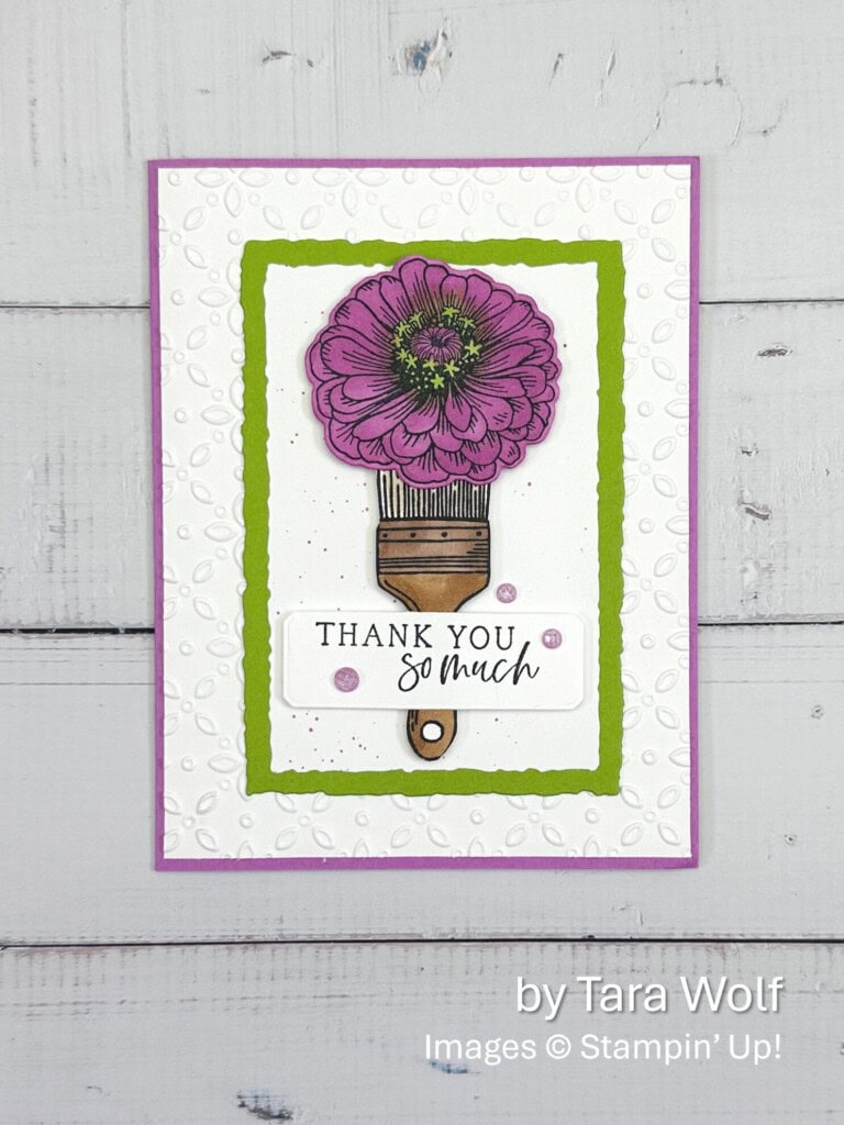 Tara’s stunning thank you card adds a bright zinnia to a paintbrush. What a fun idea to mix the flower from Flowering Zinnias with the paintbrush from the Trusty Tools stamp set! Not only did she beautifully color her images, but she layered the flower and brush with gorgeous layers and textures. Here’s Tara’s swap card: