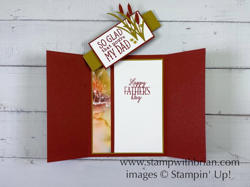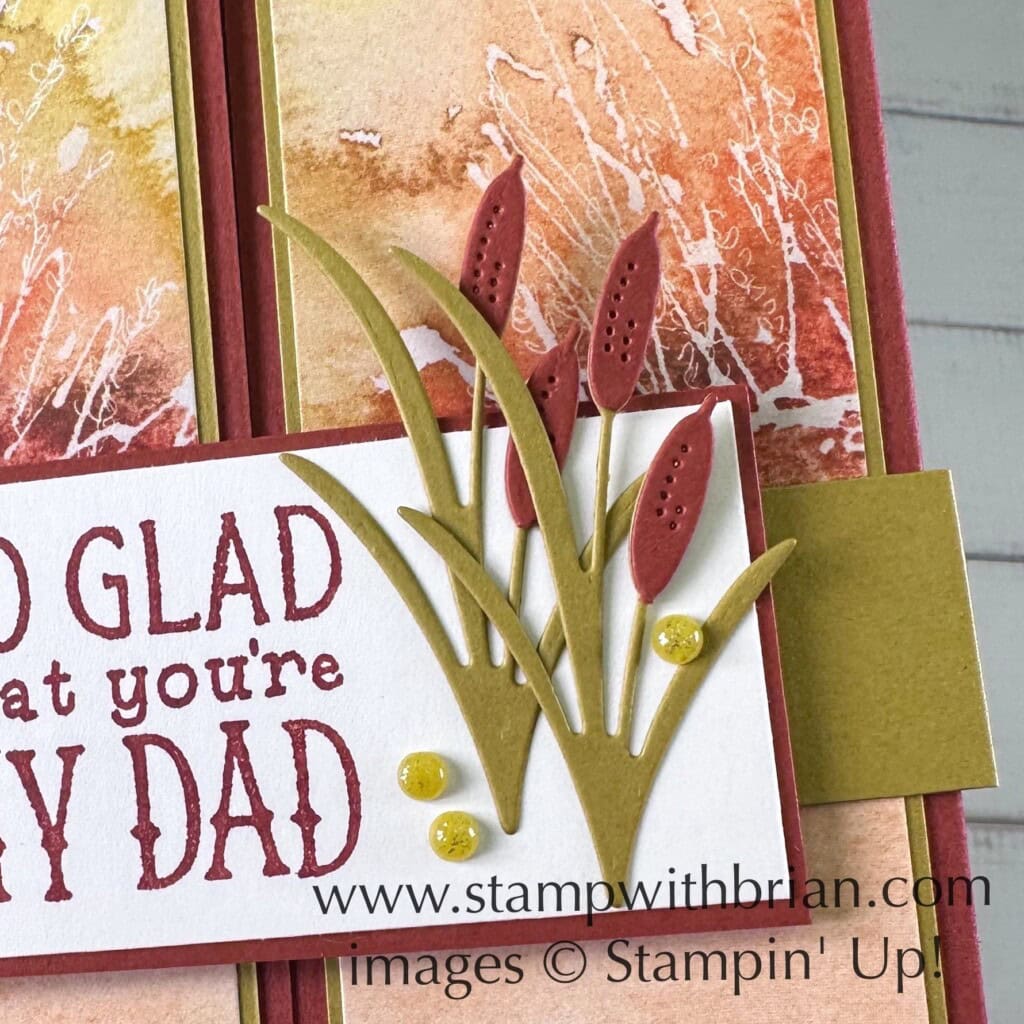 The sentiments on the front of the card (and the inside) are from the Gone Fishing stamp set, a carried over stamp set that’s perfect for the fishing enthusiast or Dad in your life. I added two cattails to the front of the card to coordinate with the imagery of the paper. Here’s a closer look: