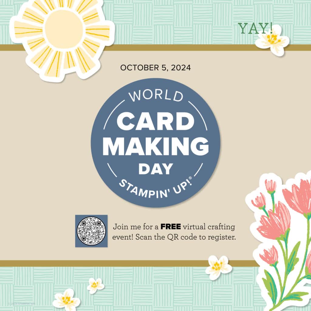 On October 5, Stampin’ Up! is hosting a free online event to celebrate World Card Making Day. What fun! To learn more and sign up, click on the image below: