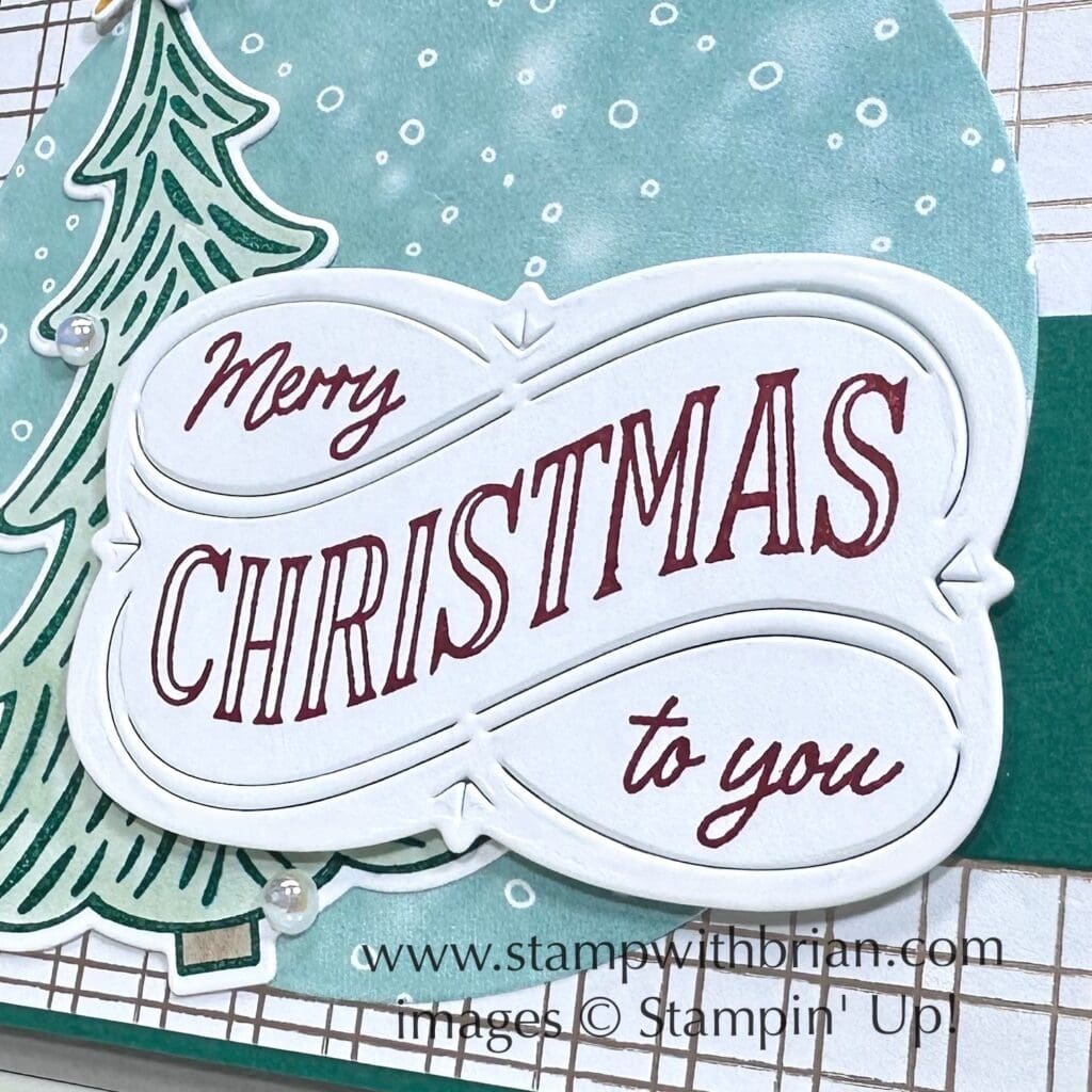 The sentiment on my card is pulled from the Christmas Labels Bundle. I love the mix of this sentiment, stamped with Cherry Cobbler ink, and the shape of this decorative die. Here’s a closer look at the sentiment on this card: