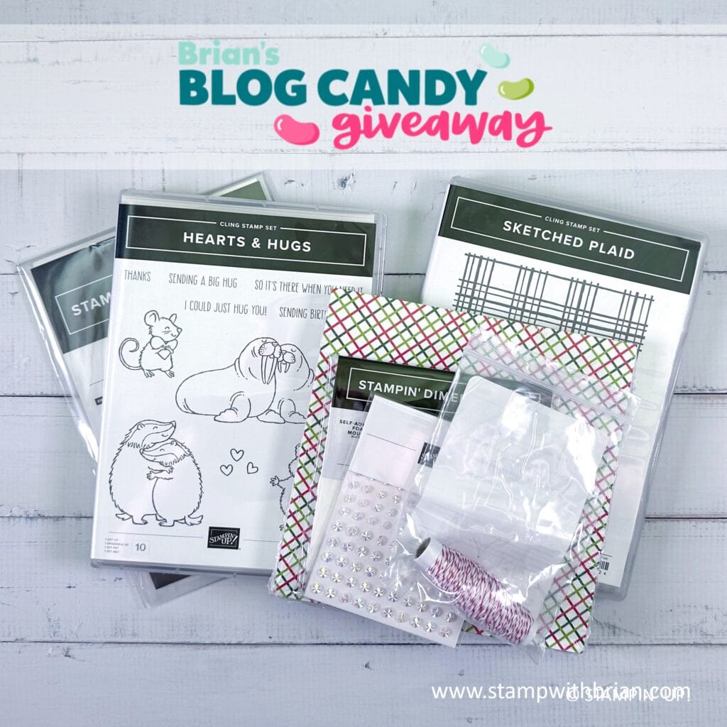 The products included in the giveaway weren’t innately connected with one another (they were pulled from a variety of suites and catalogs), but Dawn managed to fit them all together in a cohesive, adorable card. Here are the products that were included in the giveaway (the Hearts & Hugs Bundle, Sketched Plaid stamp set, Take a Bow 6″ x 6″ Designer Series Paper, Iridescent Faceted Gems, Real Red & White Baker’s Twine and Stampin’ Dimensionals):