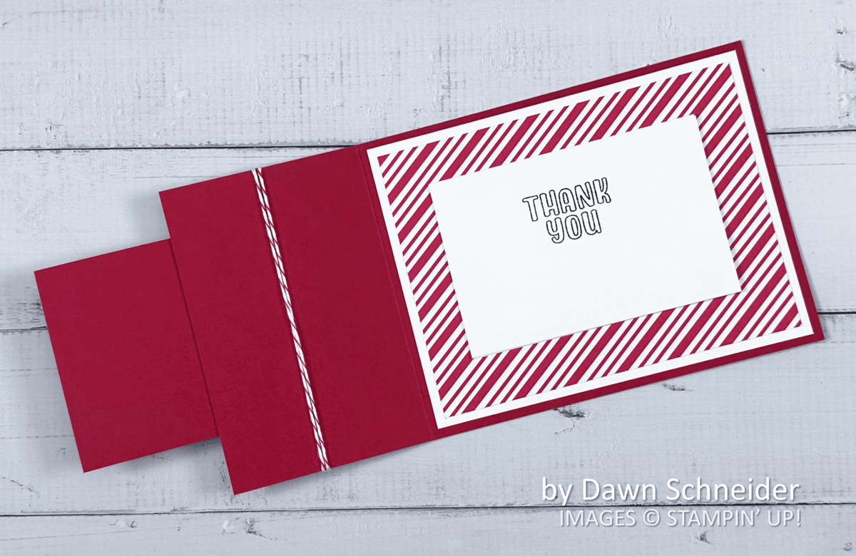 In case you missed the Sketched Plaid stamp set on this card, she’s included it at a diagonal on the square panel behind the badgers. How fun! Here’s how Dawn’s card opens up:
