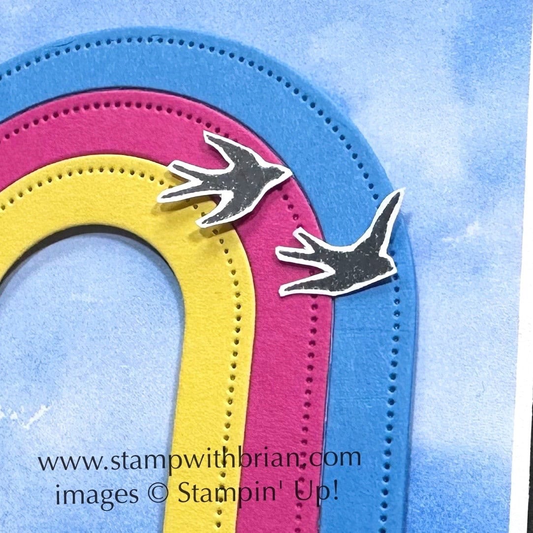 The sentiment is fashioned on two clouds from the Bright Skies Dies. I love the stitching on these clouds, too – coordinates so well with the stitching on the rainbow bands! I stamped two birds from the Everyday Arches stamps set, cut them out with my paper snips and added them to my card: