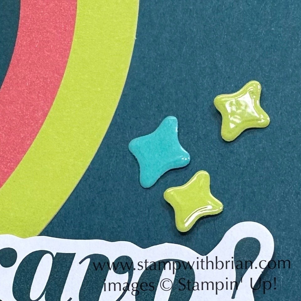 card made with the Rainbow Celebration Kit, Stampin' Up!, Brian King, FMS674I added three stars (two Lemon Lime Twist and one Summer Splash) above the sentiment. These shiny stars were cropped with the Tune In Dies. Before I cropped them, though, I added a piece of packing tape to the cardstock, giving the stars a faux-embossed shine. Love it! The mid-century design of these stars ties perfectly with the mid-century colors in the rest of the card.
