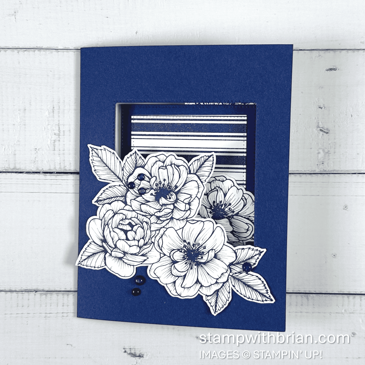 The Night of Navy card base is a standard book fold, measuring 5-1/2″ x 8-1/2″ (scored at 4-1/4″). I cropped a square out of the front of the card with the Stylish Shapes Dies and added some gorgeous flowers from the Serene Love Designer Series Paper. If you are creating along, don’t toss that cropped out square – because is shows up inside the card! Here’s a look at how the card opens: