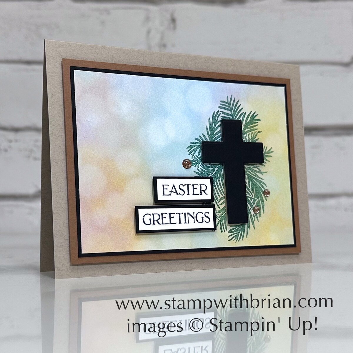 My card combines solemn stamp and die-cut images from the Faith Collection Bundle with a soft background of bokeh patterns from a Spring Mini Catalog pack of papers. I added a sentiment from Storybook Friends stamp set and shiny accents from a recent Online Exclusives offering. Together, they build a simple card that respects the solemnity of the holiday.