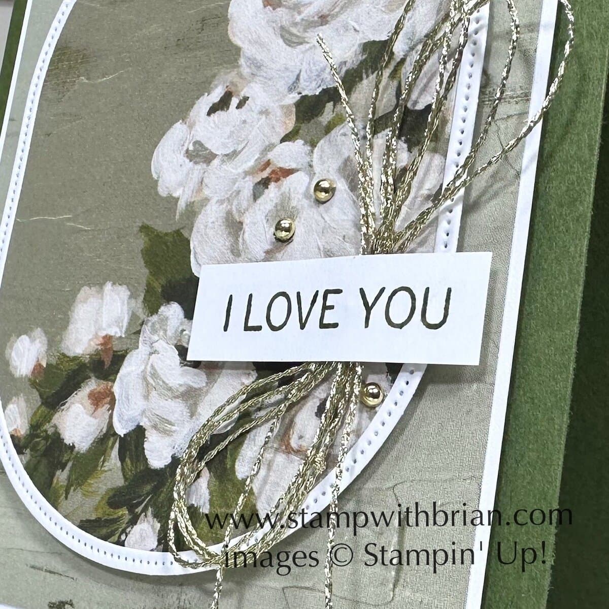 Stamps: Saying Hey Papers: Beautiful Gallery 6″ x 6″ Designer Series Paper, Mossy Meadow, Thick Basic White Inks: Mossy Meadow Accessories: Impressions Abloom Dies, Gold Twisted Thread, Blooming Pearls (gold), Mini Stampin’ Dimensionals, Stampin’ Dimensionals