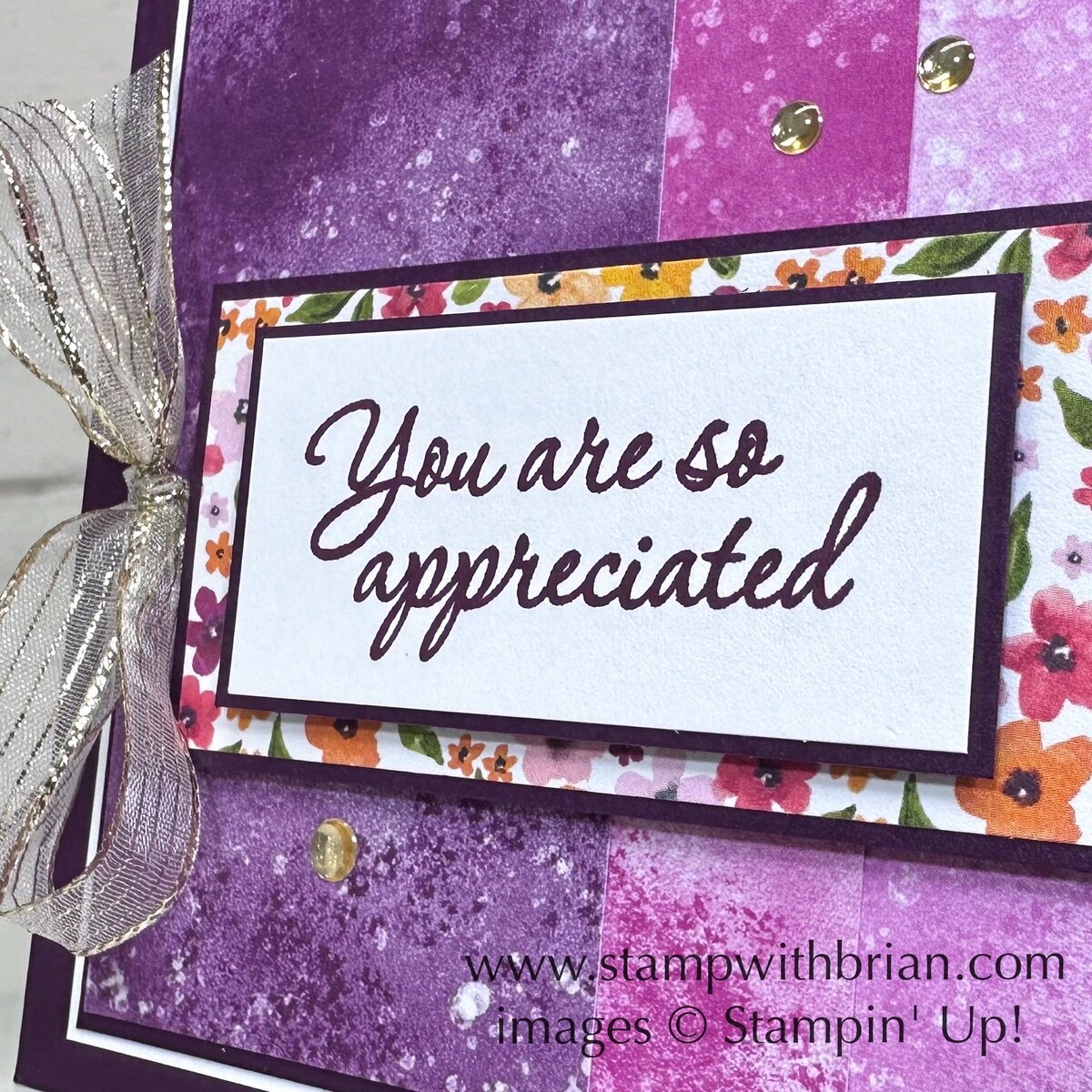Today I’m sharing a fun card I made with a lot of purple and some fun pops of gold. The layered panels of purple-y goodness (from three packs of 6″ x 6″ Designer Series Papers) are accented by a floral print from another pack of papers. Here’s the card I’m happy to share with you today: