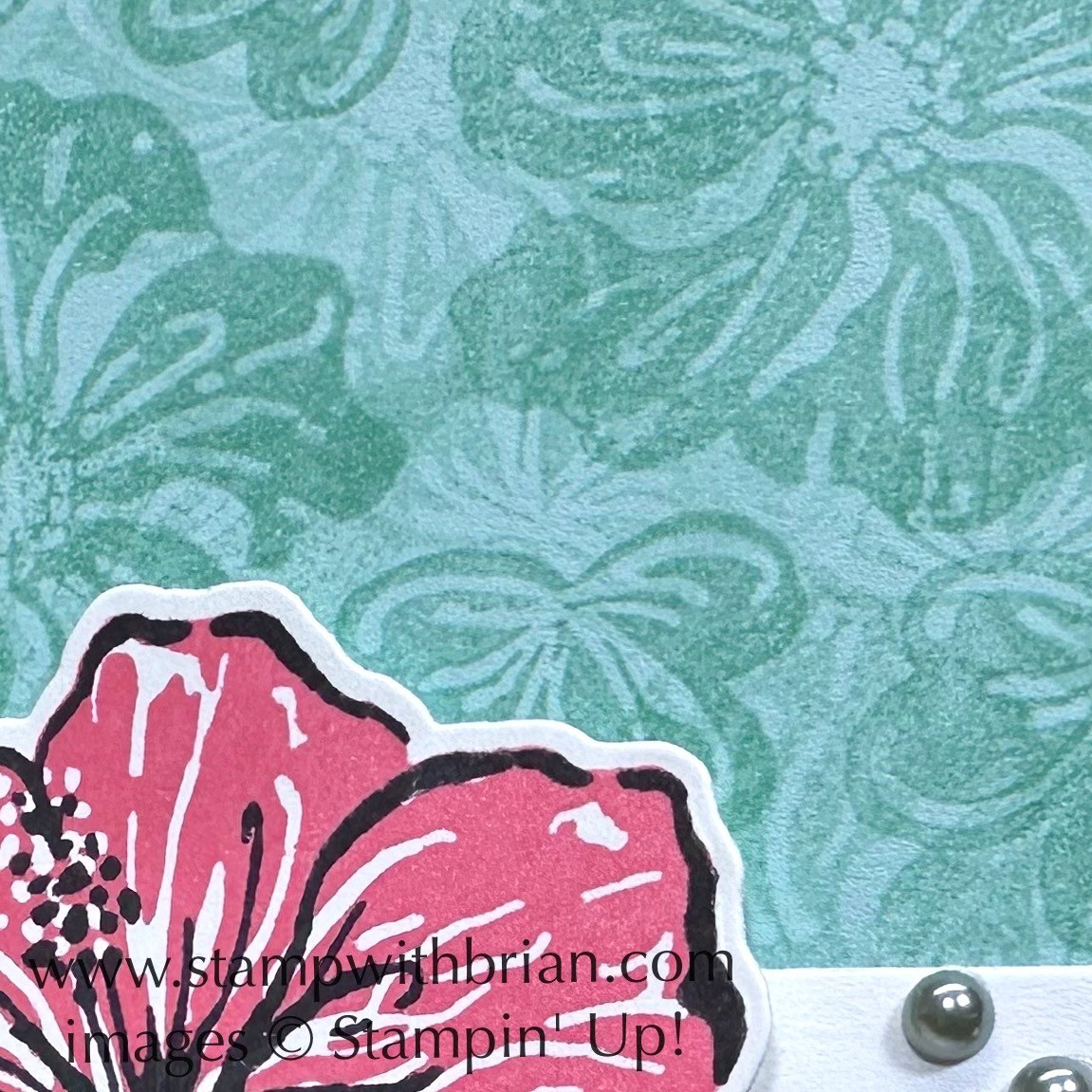 If you looked past the gorgeous flower, then you saw the textured backdrop I created on the 2-5/8″ x 3-7/8″ Pool Party panel. To build that look, I stamped the solid images of the flowers over and over with the same color of ink, stamping some of the images off once before stamping on the paper. Here’s a closer look: