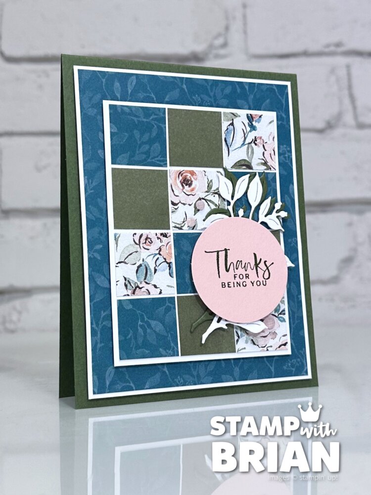 Today I’m back with another version of that same design – this time using a completely different set of papers. Instead of the envelope flaps from the Paper Pumpkin kit, I’ve cut twelve 1″ squares from a favorite Designer Series Paper to build a beautiful design. Here’s my card: