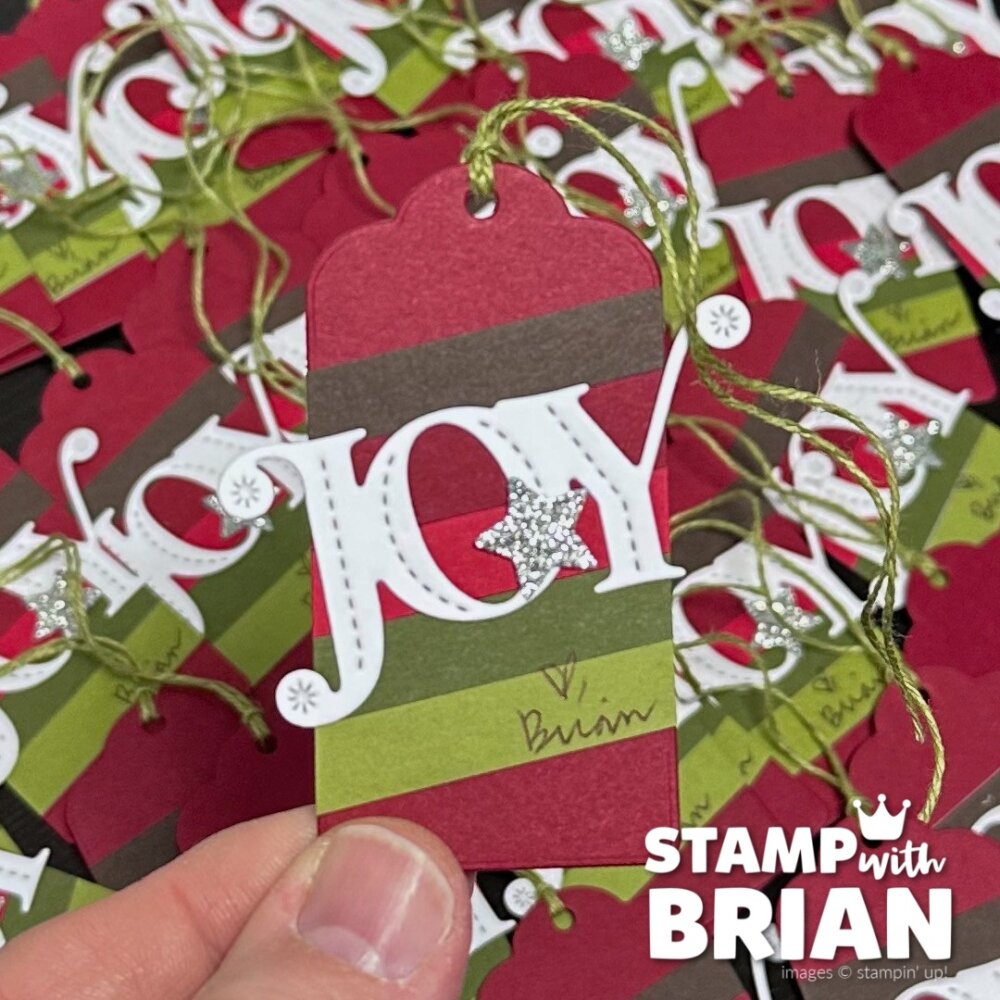 I cut the tag base from Cherry Cobbler cardstock and added a band of five 3/8″ cardstock strips across the 1-1/2″ wide tag. With that foundation in place, I added a Basic White JOY die-cut with Multipurpose Liquid Glue and a tiny silver star punched from the Peaceful Garden Glimmer Paper using the small star punch in the A Little Cheer Mini Punch Pack.