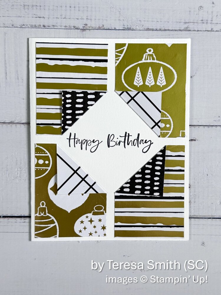 I was the lucky recipient of Teresa Smith’s card. I love the bold look of black and white with gold foil and that she made it a birthday card rather than a holiday card. What a great idea!