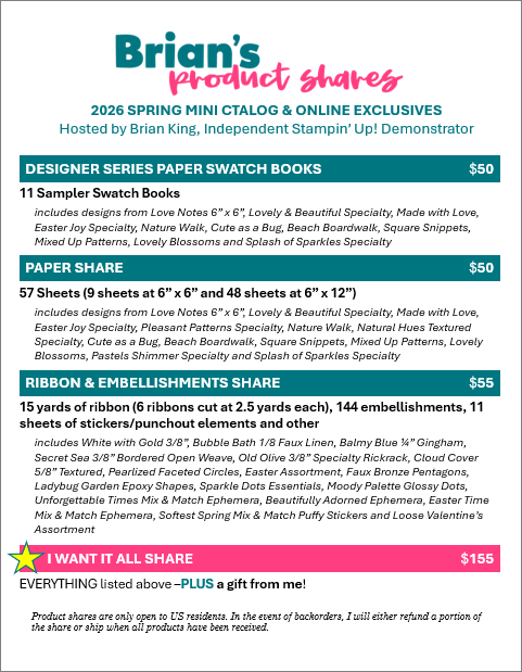 I am hosting Product Shares and making Designer Series Paper Swatch Books from the 2026 Spring Mini Catalog (and coordinating Online Exclusives). There’s no better way to get a sample of everything. If you’d like to sign up or learn more, click on the image below: