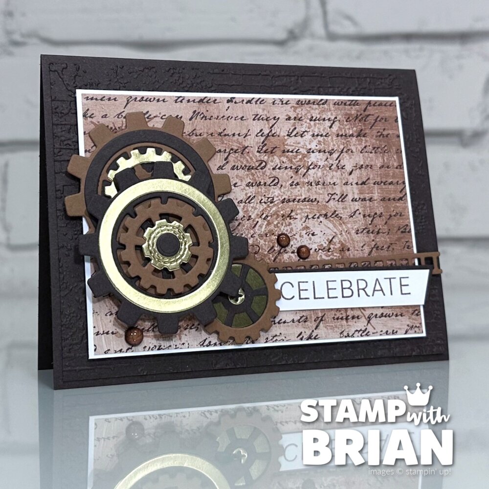 Bundles: Gears & Textures Bundle Stamps: Gears & Textures, Keeping Traditions Papers: Nature Walk Designer Series Paper, Early Espresso, Pecan Pie, Gold Foil, Basic White Inks: Pecan Pie, Early Espresso Accessories: Gears & Textures Dies, Streaked Dots, Exposed Brick 3D Embossing Folder, Stampin’ Dimensionals