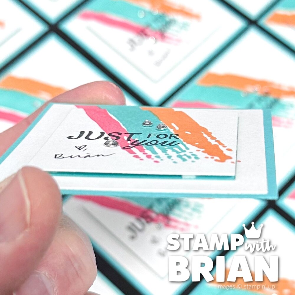 - I popped up the center of the die-cut piece with Stampin’ Dimensionals, carefully lining up the paint stripes.