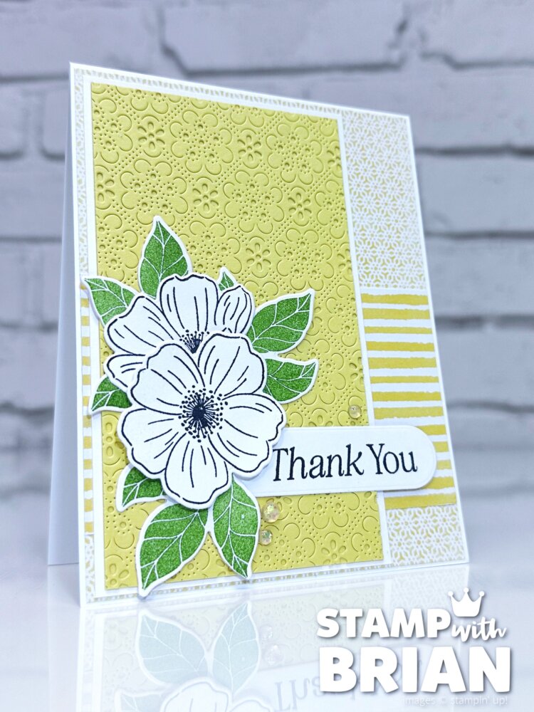I added two white flowers and Granny Apple Green leaves to my yellow panel – a crisp contrast – along with a simple sentiment from the Lovely Arrangements Bundle. The die with connected circles is what first drew me to this bundle, but I quickly fell in love with the flowers and sentiments, too.