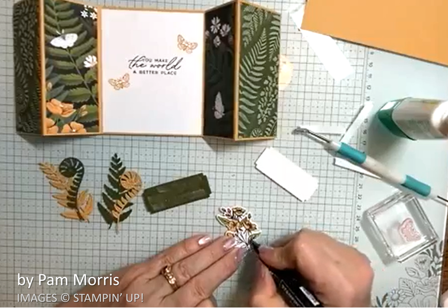 Pam kicked things off with the Fern & Flora 3D Embossing Folder – such a beauty! She embossed panels of cardstock with the detailed botanical design, then gently dragged a white ink pad across the raised surfaces. This simple technique brought all that texture to life in the most beautiful way.